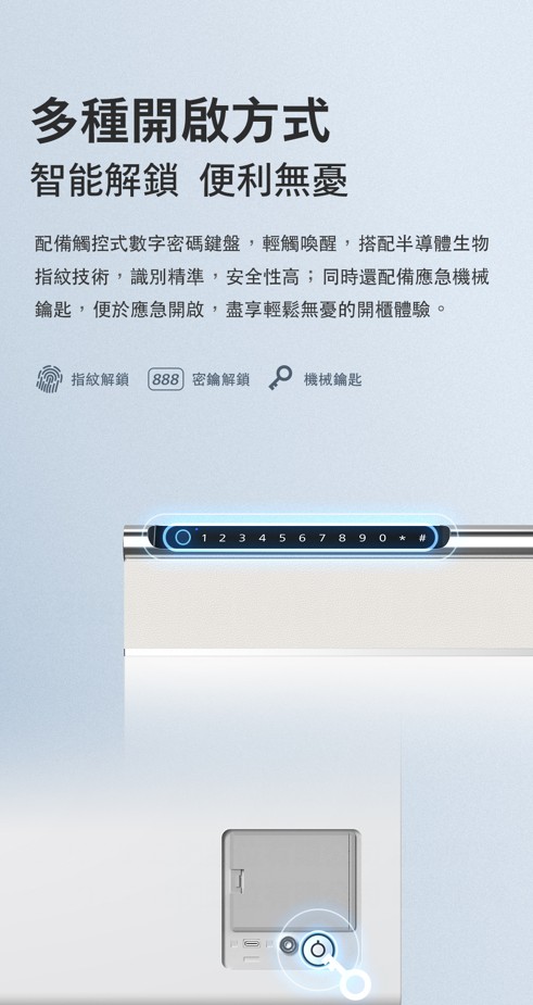 ✦ 開鎖方式:指紋120枚、密碼100組、機械鑰匙2支