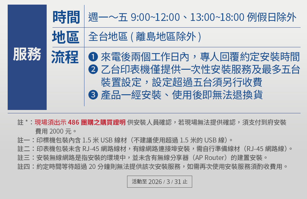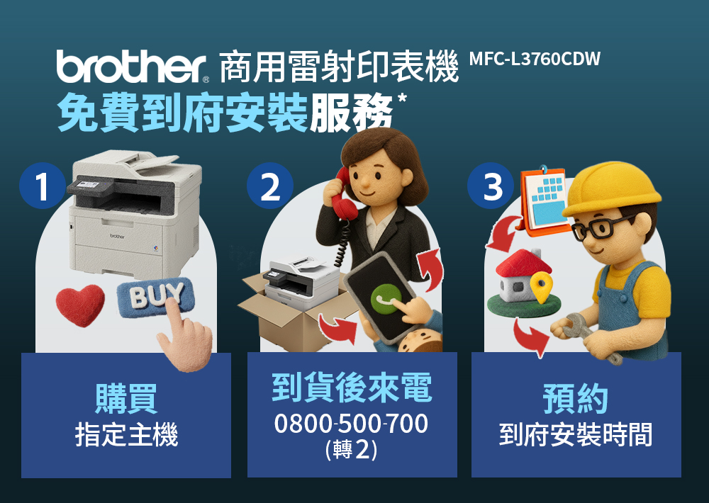 更重要的是,只要是在486團購下單的,享專案免費到府安裝(需自行申請),還能不受brother官網最低登錄金額限制,登錄就升級3年保固(一般印表機都只有1年保固)