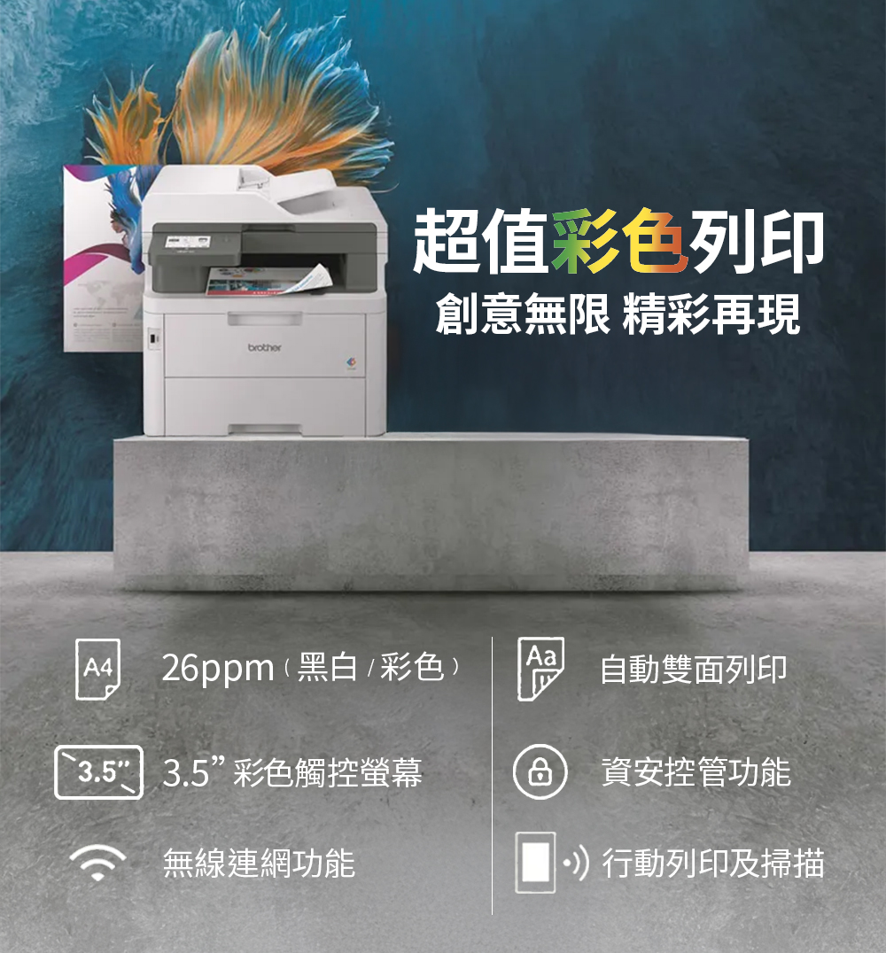 | 說明 | 彩色雷射複合機,具備自動雙面列印、掃描能力和無線連線功能 |