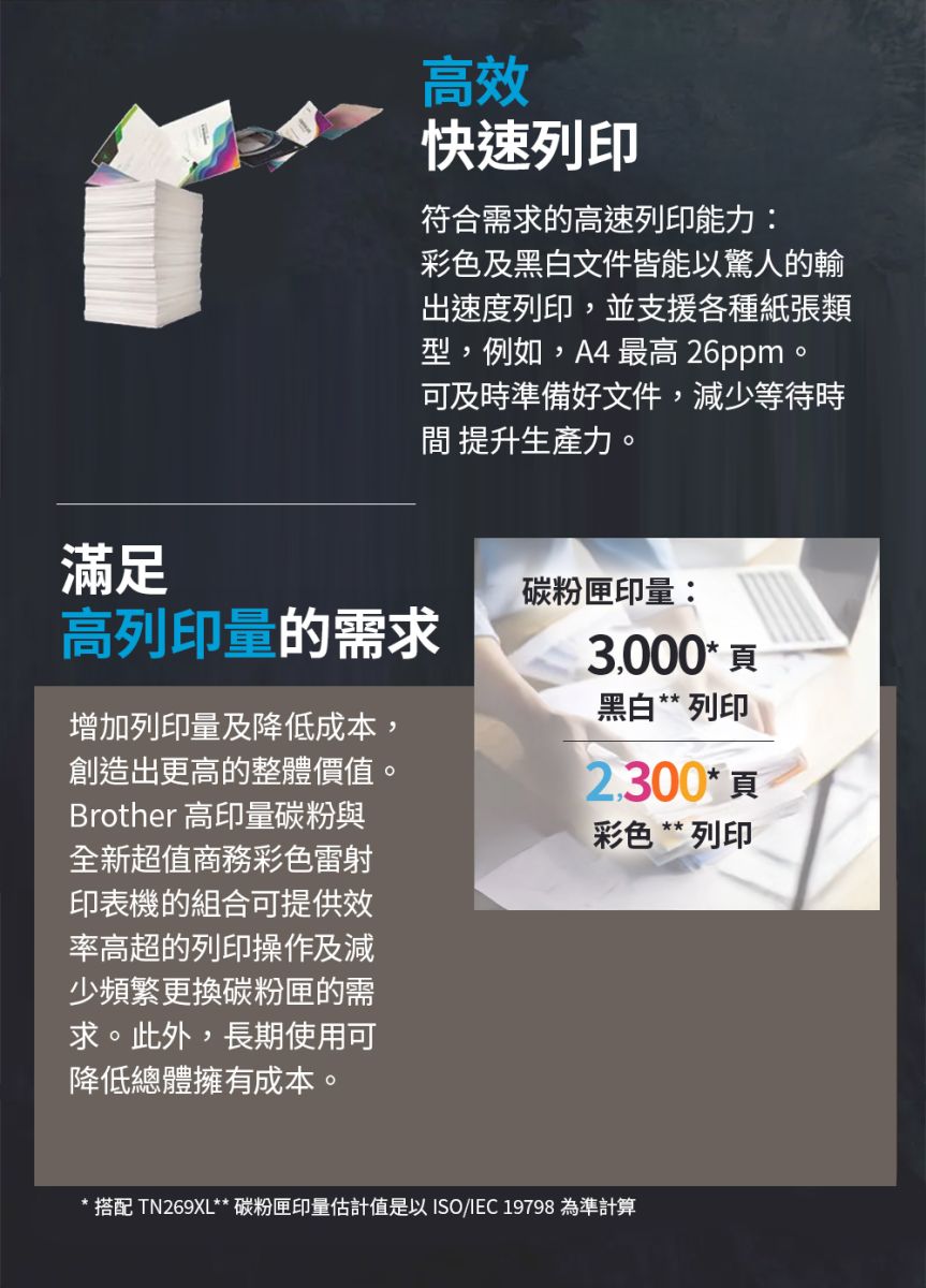 | 高印量碳粉 (TN269XL) | BK約3,000 頁 | CMY約2,300 頁 (根據 ISO/IEC 19798) |