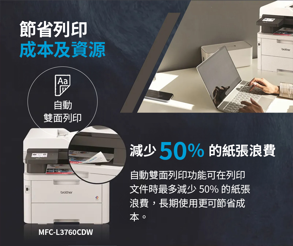brother MFC-L3760CDW商務彩色雷射複合機的碳粉和光鼓(滾筒)是分離設計,碳粉用完了,換碳粉就好,如此更環保、並大幅降低耗材成本。「Cost Down」降低成本,對企業來說絕對是重中之重。