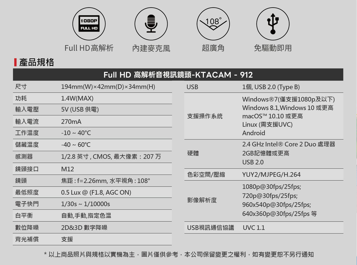 PERSONA 1080P 音視訊會議鏡頭 (直播教學/視訊監控 /網路攝影機) KTACAM-912